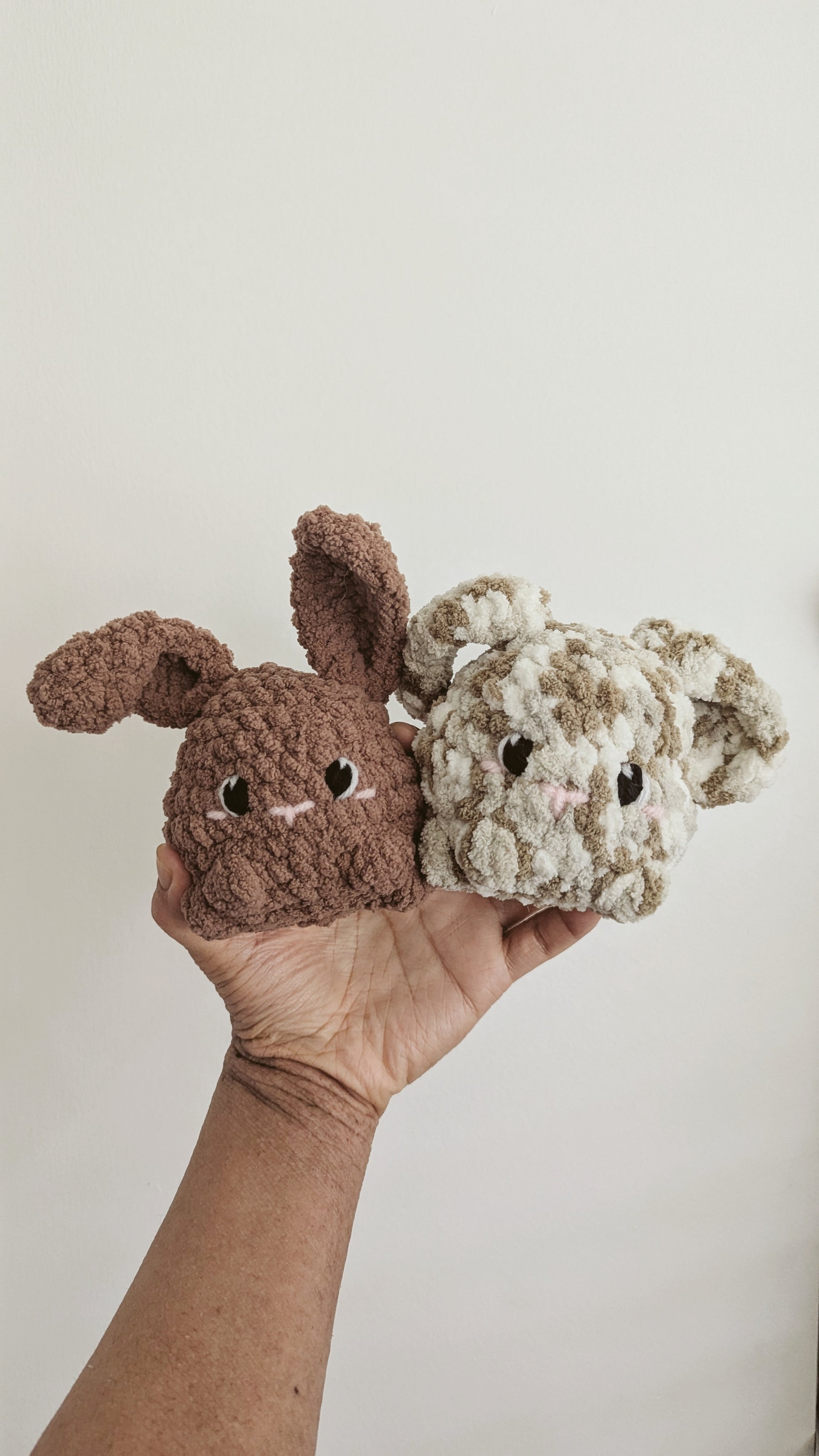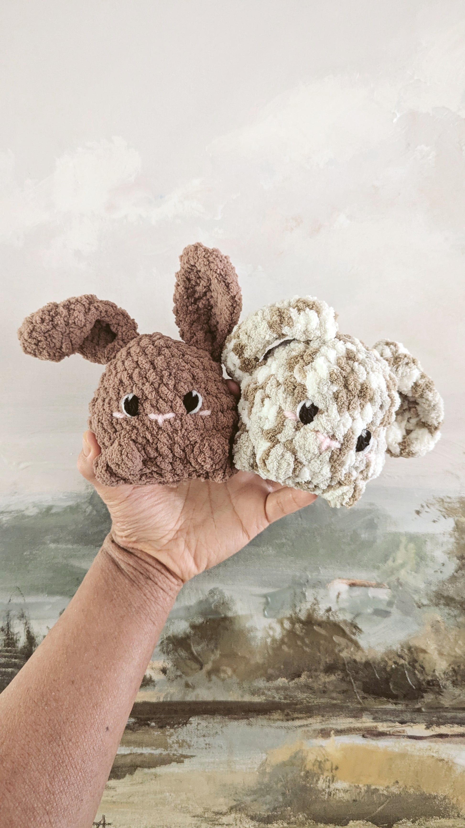 These cute chubby bunnies make the perfect Easter basket addition. Each bunny features a different set of ears. The brown bunny has both ears pointed up while the beige (mixed) coloured bunny has both ears flopped down. Both bunnies come with embroidered eyes, making them the perfect gift for littles without any risk of choking on safety eyes.